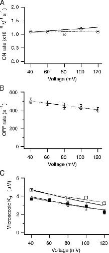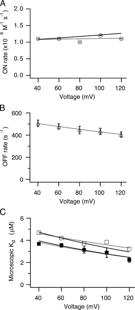 Figure 5. Average microscopic parameters of bbTBA blockade. (A) Average second order on rates calculated from kinetic measurements at each voltage as in Fig. 4 were fitted to Eq. 2 either by Igor (dashed line) to yield (parameters ± 95% confidence interval) kON(0) = 1.108 ± 0.3 × 108 M−1s−1 and zδON = 0.012 ± 0.093, or with the final model (solid line) with parameters: kON(0) = 1.0 × 108 M−1s−1 and zδON = 0.05. Data were averaged from six patches; error bars represent the standard deviation of fits of kON vs. [bbTBA] as in Fig. 4 C. (B) Average off rates (±SEM; n = 6 patches) were plotted as a function of voltage and fitted to Eq. 2 (dashed line), yielding parameters (±95% confidence interval) kOFF(0) = 562 ± 27 s−1 and zδOFF = 0.07 ± 0.015. (C) Average microscopic Kd measured from steady-state open probability (filled squares) or kinetics (open squares) were plotted as a function of voltage and fitted with Eq. 2 either by Igor (dashed lines) with parameters (±95% confidence interval): steady-state, Kd = 4.8 ± 1.1 μM and zδ = 0.14 ± 0.08; kinetic, Kd = 5.5 ± 1.1 μM and zδ = 0.11 ± 0.07, or the final model (solid lines) with parameters: steady-state, Kd = 5 μM and zδ = 0.15; kinetic, Kd = 6 μM and zδ = 0.15. (In this particular instance, the Kd in the final model was not constrained to the 8–10 μM range, in order to account for microscopic measurements made earlier in time; see Materials and methods). Error bars represent the standard deviation from fits of the Po vs. [bbTBA] curves as in Fig. 4 D. The Kd for the kinetic measurements was taken to be the intersection where kON = kOFF. Data were averaged from six or four patches for kinetic and steady-state measurements, respectively.