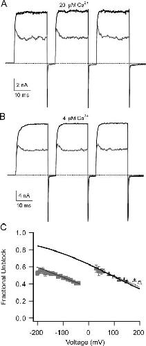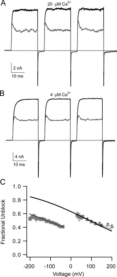 Figure 7. BK channels show no evidence of trapping bbTBA inside the cavity after closure. (A) To test for trapping, channels were stepped from a holding potential of −200 mV to a test potential of +150 mV three times, separated by a 5-ms interpulse interval at −200 mV, first in a control solution containing 20 μM internal Ca2+ (black traces), and then in 5 μM bbTBA (gray traces). Traces were then superimposed (one control sweep, average of three sweeps in blocker) for comparison. (B) The trapping experiment was repeated in 4 μM internal Ca2+, where open probability at −200 mV was roughly an order of magnitude lower (∼0.00001; Horrigan and Aldrich, 2002), in order to minimize the possibility of escape of blocker from channels reopening during the 5-ms repolarization to −200 mV. In this experiment, the test potential was +200 mV, and the traces shown are averages of three (control) or four (bbTBA) sweeps. This experiment in 4 μM Ca2+ was repeated in eight different patches. (C) Fractional unblock (1 − IbbTBA/Icontrol) was measured in 100 μM internal Ca2+ either from steady-state currents (black triangles; n = 19 patches ± SEM) or peak tail currents (gray squares; n = 4 patches ± SEM) and plotted as a function of test voltage. The steady-state data are the high Po measurements displayed in Fig. 8 C. Steady-state data were fit with Eq. 3 either by Igor (dashed line; parameters ± 95% confidence interval were Kd(0) = 8.3 ± 1.2 μM and zδ = 0.14 ± 0.03) or by our final model (thick black line, Kd(0) = 8.5 μM and zδ = 0.15). The final model fit was then extrapolated to negative potentials. Fractional unblock computed from tail currents was also fitted (thin gray line) with parameters (±95% confidence interval): Kd(0) = 2.9 ± 1.8 μM and zδ = 0.12 ± 0.016. The observed level of block at negative potentials is much greater than steady-state predictions, indicating that bbTBA has not dissociated from channels at the time of closing. The persistence of time-dependent block after closure and reopening of blocked channels suggests that bbTBA is able to dissociate from closed channels during the 5-ms repolarization.
