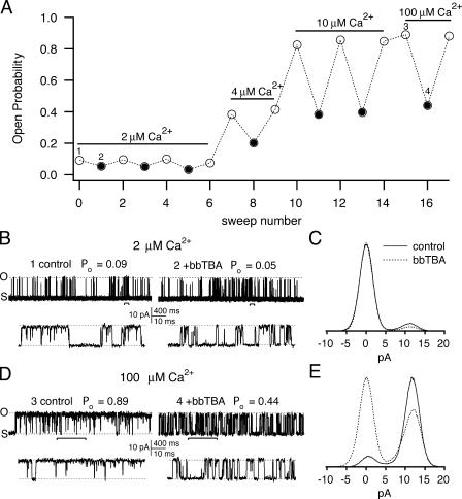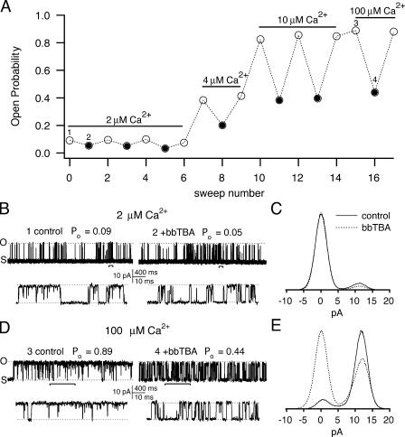 Figure 9. Microscopic steady-state block decreases slightly at low Po. (A) A typical experiment where block was evaluated at several different Ca2+ concentrations is illustrated. Each experiment consisted of several “trials,” where block was measured at a particular Ca2+ concentration, beginning with the lowest value (2 μM). Within each trial, a control solution (open circles) was alternated with the corresponding blocker solution (+5 μM bbTBA, filled circles) several times while channel activity was monitored with 10-s sweeps to +40 mV. Po was calculated from each individual sweep by integrating Gaussian fits to raw amplitude histograms (Po = Po/Po + Pc). The illustrated time course allowed us to directly monitor Po during the course of an experiment. Trials consisting of acceptably stable sweeps were identified using the following selection criteria. For Po ≤ 0.15, each control record was required to be ±0.01 Po units of the preceeding control. For Po > 0.15, control Po values that were within 0.1Po unit were accepted (e.g., ±0.05). Thus, for any particular Ca2+ concentration, episodes of block were only accepted when sandwiched by stable control activity. After identifying stable records, raw amplitude histograms were constructed from all acceptable control records and blocker records within a trial (10–40 s total for each) and fitted with Gaussian functions in order to yield the average Po values. Fractional block at that Ca2+ concentration was calculated as 1 − PobbTBA/Pocontrol. Fractional block for a few experiments was also computed from bursts of activity ± bbTBA, such as those illustrated in B and D on an expanded time scale; percent block from these analyses was within 5% of that calculated from the complete dataset. Long closures were occasionally omitted from records. (B) Representative sweeps illustrating block at low Po (sweeps number 1 and 2 in A). The top row illustrates 4 s of recording in 2 μM internal Ca2+ (sweep 1) and 2 μM Ca2+ + 5 μM bbTBA (sweep 2). Average Po under these conditions for this experiment was 0.09 or 0.05, respectively. 100-ms sections (indicated by brackets) are shown on an expanded time scale below each trace. All sweeps in this figure were filtered at 2 kHz for illustration purposes. (C) Fractional block was calculated from the average raw amplitude histograms for the control (solid line) and 5 μM bbTBA (dashed line) data. For this experiment, at Po = 0.09, fractional block was 44.5%. (D) Block at high Po is illustrated by 500 ms of recording in 100 μM internal Ca2+ (sweep 3) or 100 μM Ca2+ + 5 μM bbTBA (sweep 4), where Po was 0.89 or 0.44, respectively. 100-ms sections (indicated by brackets) are shown below each trace on the same expanded time scale as in B in order to facilitate comparison with the traces in 2 μM Ca2+. (E) Fractional block computed from the raw amplitude histograms for this experiment at Po = 0.9 was 51.2%. The efficacy of microscopic block appears to decrease by ∼6% at low Po.