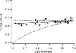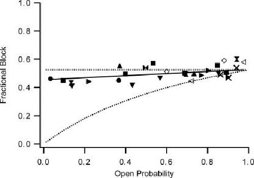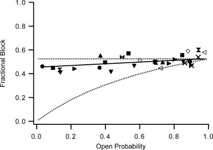 Figure 10. bbTBA blockade of BK channels closely matches predictions of a state-independent model of block. Experiments of type illustrated in Fig. 9 were repeated in 12 patches, and fractional block at +40 mV was plotted versus Po calculated directly from the raw amplitude histograms. Data from each experiment are indicated by a separate filled symbol. Open symbols represent measurements of block at two different Ca2+ concentrations with no washout to confirm stable Po. Crosses represent measurements of block made at only one Ca2+ concentration (stable Po confirmed with washout in two of three cases). Dashed lines represent predictions of fractional block as a function of Po made using parameters from our kinetic measurements of block at +40 mV in 100 μM internal Ca2+ (kON = 1.108 M−1s−1, kOFF = 498 s−1; Fig. 5, A and B) and Schemes 1 (final state independent) and 2 (state dependent). The solid line is a best fit of the data to the linear equation: Fractional Block = (0.073*Po) + 0.45. The 1.3-fold change in apparent affinity of block over a range of Po spanning nearly two orders of magnitude is not compatible with state-dependent block.