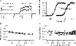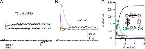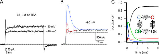 Figure 11. Blockade at high concentrations of bbTBA has three kinetic components. (A) Ionic currents (average of 10 sweeps) in the presence of 75 μM bbTBA at +90 or +150 mV. Holding potential was −80 mV. Triphasic block kinetics become more obvious at higher potentials; current rises during the first phase, then falls during the second phase, and finally rises again to steady-state levels during the third phase. (B) The current trace at +90 mV (+75 μM bbTBA) is shown on an expanded time scale. Smooth lines represent model predictions. The final state-independent model of bbTBA blockade (illustrated in C) was able to reproduce general kinetic and steady-state features of block (black dashed line). Model parameters were α = 2330 s−1 and β = 24 s−1 for channel opening and closing, respectively (using single exponential fits to activation of control current at +90 mV and Po = 0.99, 1/τ = α + β and Po = α/(α + β)), Kd(0) = 9 μM, zδ = 0.15, and 50% channels initially in CB. Minor adjustment of these model parameters (Kd(0) = 11 μM, zδ = 0.15, 35% channels initially in CB) and adding the assumption that bbTBA slows activation (from 2,330 to 1,500 s−1) produced a better fit (solid red line). This adjusted state-independent model fits only when some fraction of channels are blocked at rest (compare with dashed red line where 100% channels start in C). Using the same adjusted parameters (Kd(0) = 11 μM, zδ = 0.15, 35% CB, α = 1500 s−1, β = 24 s−1), the state-dependent model (e.g., Scheme 2) is clearly incompatible with the observed kinetics of block (solid blue line). Importantly, the state-dependent model was never able to reproduce triphasic block kinetics, even with extensive alteration of parameters (including starting up to 100% of channels in the blocked state). (C) Occupancy of the closed (C, blue), open (O, red), open blocked (OB, black), and closed blocked (CB, green) states over time illustrates the origin of triphasic block kinetics. Initial conditions for this occupancy plot modeling block by 75 μM bbTBA at +90 mV were 50% C + 50% CB; the same rate constants that were used for modeling the solid red line in B were used, as illustrated in the inset. Triphasic time-dependent block is a direct result of rapid population of blocked states prior to equilibration of the open state, in direct contrast to state-dependent models that require that the slow C to O transition be rate limiting for block. The triphasic kinetics of block observed at high concentrations of bbTBA strongly suggest that blockade is not state dependent.