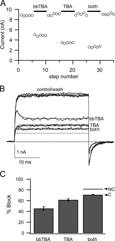 Figure 3. bbTBA behaves as a traditional pore blocker. (A) Ionic currents were sampled for 30 ms at +120 mV (from a holding potential of −80 mV) five times in each condition (100 μM internal Ca2+ or in the presence of 5 μM bbTBA, 1 mM TBA, or both blockers together) in the order shown in the time course. (B) Each set of five sweeps was averaged to yield the average traces for this experiment in the absence and presence of the indicated blocker solutions. Percent block in each case was then calculated from these average sweeps (for this experiment: bbTBA, 51%; TBA, 65%; both, 72%). Smooth lines represent modeling of ionic current under each condition. For modeling, channel opening (α = 2254 s−1) and closing (β = 46 s−1) rates were determined from a single exponential fit to the control data and assuming Po ∼ 0.98, using 1/τ = α + β and Po = α/(α + β). Kinetics of TBA block were estimated from Li and Aldrich (2004): Kd(0 mV) = 1 mM and zδ = 0.2. bbTBA block was modeled using parameters for the final model (Kd(0) = 9.9 μM and zδ = 0.15). Currents in individual blockers were modeled with Scheme 3. Block by bbTBA + TBA was modeled using either a noncompetitive (Scheme 4, dashed line) or competitive (Scheme 5, solid line) model. Time dependence was drastically slowed in both cases, but the observed steady-state level of block is compatible only with a competitive model of block. (C) The average (±SEM) percent block observed in three patches for bbTBA alone (46%), TBA alone (62%), or both blockers together (71%) follows exactly the predictions of a competitive model of blockade (71%). A noncompetitive model predicts both blockers will block 80% of total current. Predictions of percent block were calculated as described in Materials and methods. The ability of bbTBA to compete for the binding site of a known pore blocker of BK channels strongly suggests that the bbTBA binding site is located in the pore cavity.