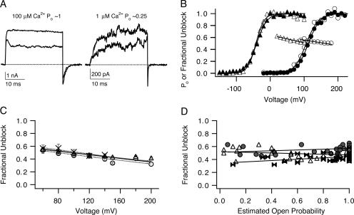 Figure 8. Efficacy of macroscopic bbTBA blockade appears largely independent of open probability. (A) Representative BK currents measured from a single patch at +90 mV from a holding potential of −80 mV, ±5 μM bbTBA in either 100 μM internal Ca2+ (Po ∼ 1) or 1 μM internal Ca2+ (Po ∼ 0.25); fractional block computed from the steady-state currents was 50.1% or 44.7%, respectively. (B) Relative Po was estimated from normalized conductance voltage relationships obtained in the absence (filled symbols) and presence (open symbols) of 5 μM bbTBA, for both 1 μM internal Ca2+ (circles) or 100 μM internal Ca2+ (triangles) solutions. Relative conductance was calculated from tail current amplitudes measured at −80 mV, and then normalized and plotted as a function of test potential. Resulting Po-V curves were fit with a Boltzmann equation (Eq. 4) to yield parameters (±95% confidence interval): 100 μM Ca2+ (control/ +bbTBA), V1/2 = −40 ± 1.5 mV/−42 ± 2.0 mV and z = 1.7 ± 0.15/2.1 ± 0.32; 1 μM Ca2+ (control/+bbTBA), V1/2 = +113 ± 1.2 mV/+107 ± 2.6 mV, z = 1.5 ± 0.9/1.4 ± 0.18. Fractional unblock (IbbTBA/Icontrol) was computed from steady-state currents ± 5 μM bbTBA exposed to 1 μM internal Ca2+ (circles) or 100 μM internal Ca2+ (triangles), plotted as a function of voltage and fitted with Eq. 3, yielding the parameters (±95% confidence interval): 100 μM Ca2+, Kd(0) = 8.9 ± 0.6 μM and zδ = 0.13 ± 0.03; 1 μM Ca2+, Kd(0) = 9.1 ± 3.6 μM and zδ = 0.09 ± 0.08. Measurements in A and B were all made in the same patch. (C) Relative Po and fractional unblock (Iblock/Icontrol) were measured over a range of test potentials from each of 24 patches in solutions ranging from 0 to 100 μM Ca2+, and measurements of fractional unblock at each voltage were binned into Po categories of “low” (0 < Po < 0.2; crosses), “medium” (0.4 < Po < 0.6; circles), and “high” (0.8 < Po < 1.0; triangles). Within each Po category, fractional unblock was averaged at each test potential, plotted ± SEM as a function of voltage, and fitted with Eq. 3 (dashed lines) to yield parameters (±95% confidence intervals): low Po, Kd(0) = 10.1 ± 5.6 μM and zδ = 0.17 ± 0.13; medium Po, Kd(0) = 8.1 ± 2.8 μM and zδ = 0.16 ± 0.09; high Po, Kd(0) = 8.3 ± 1.2 μM and zδ = 0.14 ± 0.03. A fit to the final model of bbTBA block (Kd(0) = 8.9 μM and zδ = 0.15) is also illustrated with a solid line. (D) The same fractional unblock data were then binned into three separate test voltages: +60 mV (circles), +100 mV (triangles), and +150 mV (bowties), and each data point plotted individually versus relative Po estimated from the Po -V curve for that patch. Data points within each voltage category were then fitted with a linear equation. Macroscopic fractional unblock does not depend strongly upon open probability, although block may be slightly less effective at low Po.