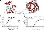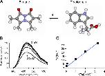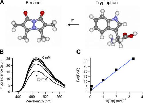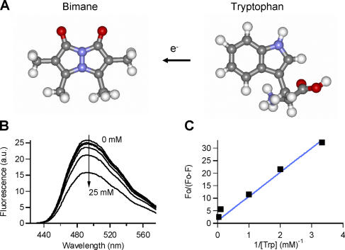 Figure 1. Mechanism of bimane fluorescence quenching by tryptophan. (A) Schematic of the electron transfer from tryptophan to bimane upon bimane excitation. The arrow represents donation of an electron from tryptophan to excited bimane. (B) Emission spectra of a 100 μM solution of bimane in increasing concentrations of tryptophan, indicated by the arrow. The reduction of the peak intensity is caused by tryptophan quenching. (C) Stern-Volmer analysis of the data in B. The straight line is a fit to the data with Eq. 3; the quenching constant K = 0.083 mM−1.