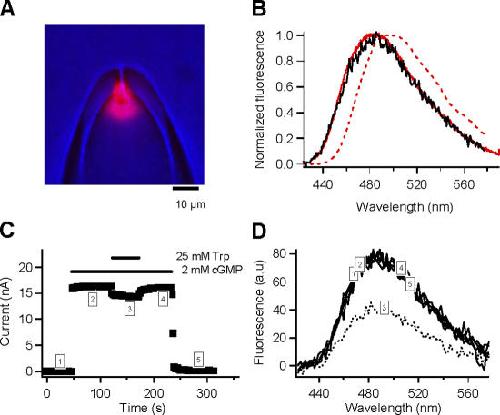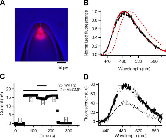 Figure 3. Spectroscopy of bimane-labeled C481 channels in patches. (A) Fluorescence image of an inside-out patch expressing C481 channels after modification with bimane maleimide. The fluorescence image is superimposed on a transmitted light image of the patch pipette. This patch contained 11 nA of cGMP-activated current, at 30 mV. (B) Emission spectrum of bimane in a patch similar to A (continuous black trace). The continuous red trace is the normalized emission spectrum of a solution of bimane maleimide–modified BSA. The dashed trace represents the emission spectrum of bimane maleimide in aqueous solution. (C) Time course of the amplitude of current elicited by 30-mV depolarizing pulses during application of 2 mM cGMP. Application of tryptophan produces a 12.7 ± 0.2% (n = 3) reversible blockade of current. (D) Emission spectra of the patch in C acquired at the times indicated by numbers. Tryptophan produces a 40% reduction in fluorescence that is completely reversible (trace 3, dotted line). There is no difference in the fluorescence of open channels (traces at times 2 and 4) and closed channels (traces at times 1 and 5).