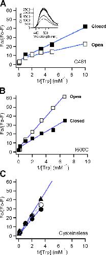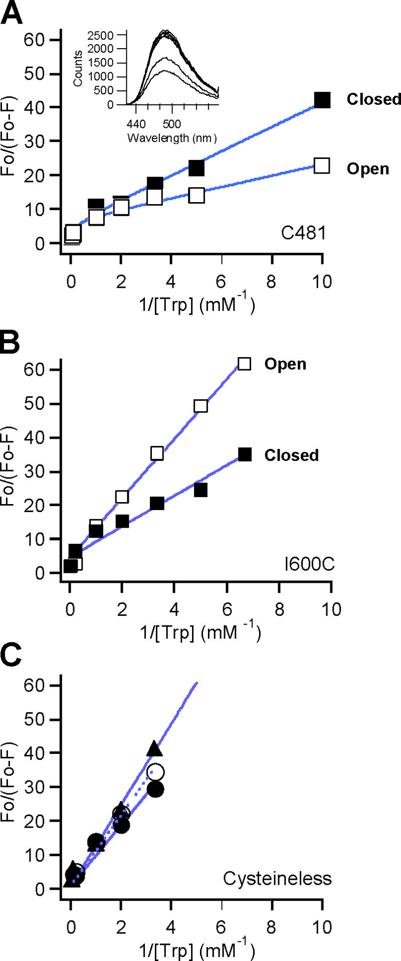 Figure 4. Quantification of bimane fluorescence quenching by applied tryptophan in solution. (A) Stern-Volmer plot analysis of a bimane maleimide–modified patch expressing C481 channels. Tryptophan quenching is more effective in the open state than in the closed state. The curves are fits of Eq. 4 with values: (closed) f = 0.15, K1 = 1.72 mM−1, and K2 = 0.026 mM−1; (open) f = 0.15, K1 = 3.73 mM−1, and K2 = 0.025 mM−1. The inset shows the patch emission spectra at different concentrations of tryptophan. (B) Quenching characteristics of I600C channels. Quenching is more effective in the closed state than in the open state. The curves are fits of Eq. 4 with values: (closed) f = 0.20, K1 = 1.092 mM−1, and K2 = 0.0052 mM−1; (open) f = 0.20, K1 = 0.55 mM−1, and K2 = 0.0061 mM−1. (C) Tryptophan quenching of a bimane-labeled inside-out patch containing cysteineless CNGA1 channels in the presence of 2 mM cGMP (open circles) and in the absence of nucleotides (closed circles). Smooth curves are fits of Eq. 3 with values: (closed) K = 0.11 mM−1; (open) K = 0.096 mM−1. Quenching of bimane maleimide in solution is represented by the triangles. The quenching constant K is 0.083 mM−1.