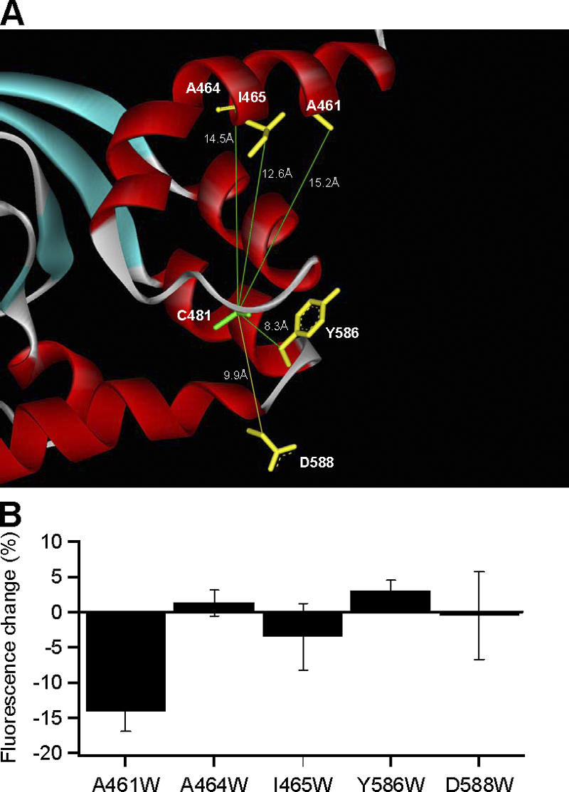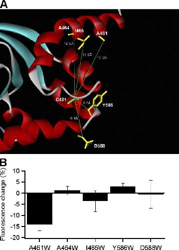 Figure 6. Location and quenching effects of tryptophan mutants. (A) Homology model of one subunit of the CNGA1 channel, showing the location of residues that were mutated to tryptophan. The numbering is that of the CNGA1 sequence. Distances to the α-carbon of C481 are indicated by green lines and are given in angstroms. (B) Quantification of the degree of state-dependent quenching of bimane in C481 produced by individual tryptophan residues. The bars represent the mean. The error bars are the SEM.