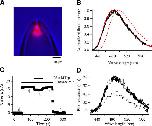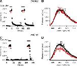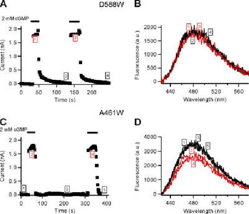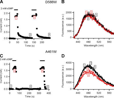 Figure 7. Fluorescence changes in tryptophan mutants. (A) Currents from D588W channels after bimane modification upon application of 2 mM cGMP elicited by pulses to 30 mV. (B) Spectra taken at the times indicated by the numbers in A. (C) Currents from A461W channels after bimane modification upon application of 2 mM cGMP elicited by pulses to 30 mV. (D) Spectra taken at the times indicated by the numbers in C. Red traces are the open channel emission spectra, and black traces are the closed channel emission spectra. Quenching of peak fluorescence in A461W channels upon opening is ∼18%.