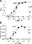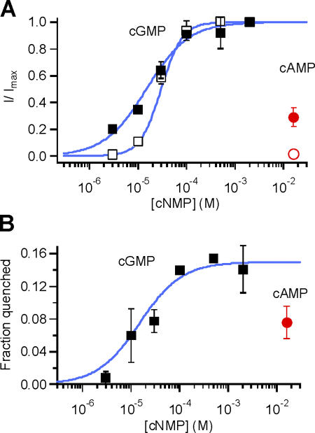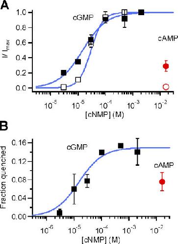 Figure 8. The cyclic nucleotide dependence of bimane quenching suggests that fluorescence reports a conformational change associated with channel opening. (A) Average cyclic nucleotide dose–response relations of unmodified and modified channels. Open squares are the cGMP dose–response data before modification. The smooth curve is a fit of Eq. 1 with Kd = 30 μM and n = 2.0. The open circle is the response to 16 mM cAMP, before modification. Closed squares are the cGMP dose–response data after modification. The data were fit with Eq. 1, with Kd = 15 μM and n = 1.0. The closed circle is the response to 16 mM cAMP after modification. (B) cGMP dose–response relation of bimane quenching in modified A461W channels. The data were fit with Eq. 1 with a maximum value of 0.15, and the same parameters used for the cGMP dose–response relation of modified channels in A. The red symbol is the quenching observed when the channels are opened by 16 mM cAMP and was corrected for the 3.1 ± 0.6% (n = 3) quenching of bimane produced by 16 mM cAMP alone.