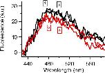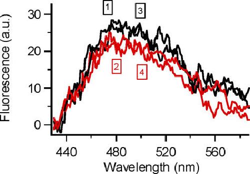 Figure 9. Fluorescence changes in A461W-C481 channels modified with 250 μM monobromobimane. After modification, spectra were acquired in the absence of cyclic nucleotide (closed state, black traces) or in the presence of 2 mM cGMP (open state, red traces) in the order indicated by the numbers in boxes. The amount of quenching in this experiment was 14.8%.