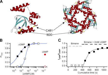 Figure 2. Characteristics of the C481 mutation. (A) Location of residues C481 and I600 in a homology model of the CNGA1 carboxy-terminal region based on the x-ray crystal structure of HCN2. (B) Cyclic nucleotide dose–response relations of unmodified and modified channels. Open squares are the cGMP dose–response data before modification. The smooth curve is a fit of Eq. 1 with Kd = 40 μM and n = 2.2. The open circle is the response to 16 mM cAMP, before modification. Closed squares are the cGMP dose–response data of the same patch after complete modification with 250 μM bimane maleimide in the presence of 2 mM cGMP. The data were fit with Eq. 1, with Kd = 4.0 μM and n = 0.84. The closed circle is the response to 16 mM cAMP after modification. (C) Time course of C481 modification by 400 μM bimane maleimide. Application of bimane maleimide in the absence or in the presence of 2 mM cGMP is indicated by the gray and black bars, respectively. Modification, as measured by the potentiation of the current in 16 mM cAMP relative to the current in 2 mM cGMP, occurs exceedingly slowly in closed channels (open squares), but proceeds with a rate constant of 29 ± 3.9 M−1s−1 (n = 3) in open channels (solid squares). The smooth line is a fit of Eq. 2 with a rate k = 0.0098 s−1 and m = 2.