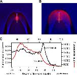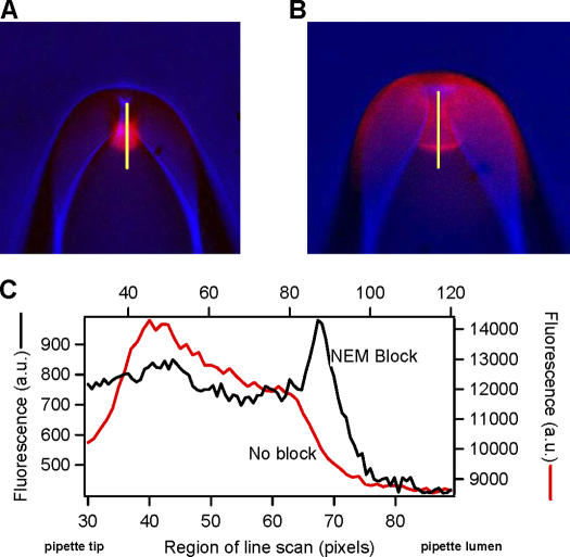 Figure 5. Components of patch fluorescence. (A) Fluorescence emission image of a patch expressing C481 channels modified with bimane maleimide without NEM block. The yellow line indicates the region used in the scan in C. The exposure to the 405-nm laser was 300 ms. (B) A patch expressing C481 channels modified after cysteine block with 1 mM NEM for 4 min in the closed state. The exposure was 1 s, with eight times the laser intensity used in A. (C) Line scans of the images in A and B.