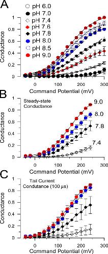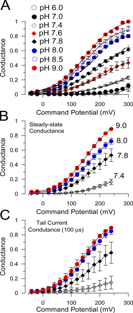 Figure 2. pH dependence of Slo3 macroscopic conductance. In A, steady-state currents were measured from records as in Fig. 1 and converted to conductances. For results from any individual patch, G/V curves were normalized to the maximal conductance observed with pH 9.0. The full set of pH was not tested on all patches, but each point is the mean of 4–18 patches. In B and C, macroscopic conductance was determined both from steady-state currents (B) or tail currents (C) for a set of four patches at pH of 7.4, 7.8, 8.0, and 9.0. For tail current G/Vs a single current value at 100 μs after the nominal onset of the voltage step was used.