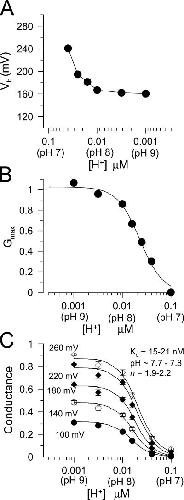 Figure 3. Empirical properties of Slo3 G/V curves. In A, the voltage of half activation (Vh) is plotted as a function of proton concentration. Vh estimates were based on Boltzmann fits (Eq. 1) in which Gmax was not constrained. In B, Gmax obtained from fits of Eq. 1 to G/V curves at each pH are plotted as a function of [H+]. The solid line is a fit of Hill equation (G([H+]) = Gmax/{1 + ([H+]/Kd)n}), yielding an effective Kd of 23.3 ± 2.9 nM and with n = 1.9 ± 0.4. In C, the normalized conductance is plotted as a function of [H+] for a range of command potentials. Solid lines show the best fit of a similar Hill function to conductance estimates at each voltage. The range of estimates for Kd was 15–21 nM corresponding to pH of 7.7–7.8, with minimal voltage dependence in the estimates. Estimates of n ranged from 1.9 to 2.2.