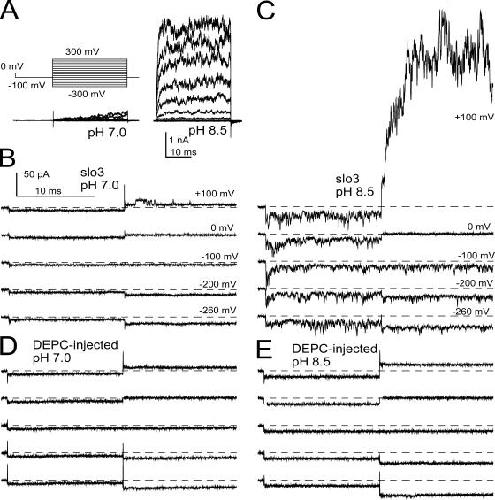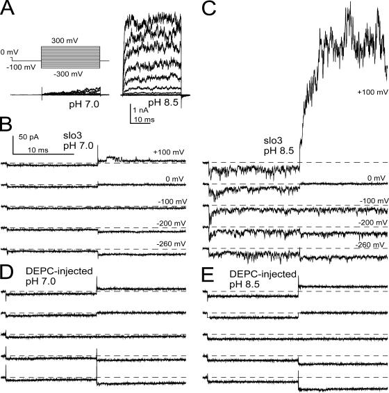 Figure 4. There is appreciable pH-dependent Slo3 current at negative potentials. In A, families of Slo3 currents activated by the indicated voltage protocol are shown for pH 7.0 and 8.5. Test steps to potentials from −300 to +300 mV were preceded by a conditioning step to −100 mV. Each trace corresponds to a single sweep. In B, high gain records for traces in A at negative potentials are displayed on a faster time base showing the absence of channel activity at pH 7.0. In each case, a brief period at 0 mV preceded the step to −100 mV, before the final test step. In C, similar traces at pH 8.5 show increased variance due to channel activity. In D, current traces for the same range of voltages at pH 7.0 are shown for an inside-out patch from an oocyte injected with DEPC. In E, traces are from the same patch as in D, but at pH 8.5, showing that pH increases leak current without any obvious increase in current variance.