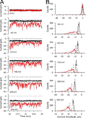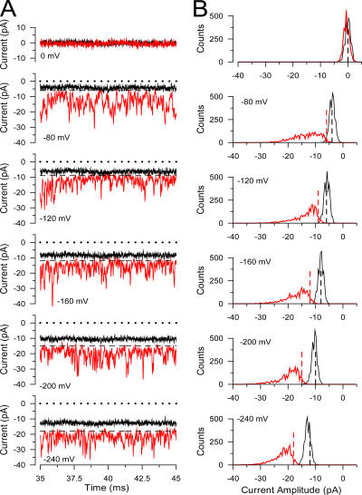 Figure 5. Evaluation of the average Slo3 current magnitude at negative potentials. In A, segments of currents obtained at either pH 7.0 or pH 8.5 are compared over a range of voltages for the patch shown in Fig. 4. Dotted line corresponds to the zero current level, and the dashed line corresponds to a baseline that reflects a leak conductance that is voltage independent over this range of voltages. The baseline level was chosen so that the range of current levels positive to this baseline was similar to the variance observed around the baseline for currents at pH 7.0. In B, total amplitude histograms for traces at pH 7.0 and pH 8.5 are shown, with vertical lines corresponding to the baseline used in the two cases. Note the asymmetry in the traces at pH 8.5 and symmetry at pH 7.0. The Slo3 conductance at negative potentials was estimated based on the integral of current values in the distributions at pH 8.5, after baseline subtraction.