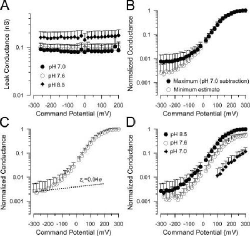 Figure 6. Voltage dependence of Slo3 conductance at negative potentials. In A, the voltage dependence of leak conductance in inside-out patches from DEPC-injected oocytes is displayed at each of three pH, 7.0, 7.6, and 8.5. The increase in leak conductance with increases in pH is not associated with any visually observable increase in current variance. In B, the voltage dependence of Slo3 conductance over the range of −300 to +300 mV is shown for two different methods of correction for leak current. Solid circles correspond to conductance estimates in which the leak conductance observed at pH 7.0 was subtracted on a patch by patch basis from the conductance observed at pH 8.5. This represents the maximum possible estimate of the Slo3 conductance at negative potentials. Open symbols correspond to conductance estimates derived from defining a linear leak conductance at pH 8.5 based on the most positive current over voltages from −100 through −240 mV (as illustrated in Fig. 6). This represents the minimal possible estimate of Slo3 conductance at negative potentials. In C, Slo3 conductance estimates at pH 8.5 over the range of −300 through −220 mV were fit by G(V) = L(0)*exp(zL*V/kT), yielding an estimate of zL of 0.04 ± 0.08. After conversion of normalized conductance to absolute Po (Zhang et al., 2006), L(0) was 1.25 ± 0.10 * 10−3. In D, the log(G) vs. V relationships for pH 8.5, 7.6, and 7.0 are shown.