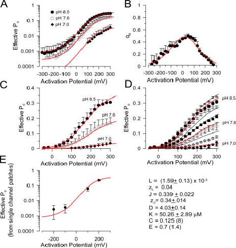 Figure 7. Slo3 steady-state conductance can be described by Scheme 1. In A, the log(Po) vs. voltage relationships at pH 7.0, 7.6, and 8.5 were fit (red line) with Scheme 1, assuming zL = 0.04, and constraining C and E. Macroscopic conductances were converted to Po based on the estimates of unitary current Po in the accompanying paper (Zhang et al., 2006). In B, qa, the mean activation charge displacement, was determined from the slope of the log(Po) vs. V relationship. Each qa estimate was determined from the slope of the log(Po) vs. V values for each sequential set of four voltages, covering a 60-mV range. Error bars correspond to the confidence limit on the fit to the slopes. The red line corresponds to the expected qa/V relationship based on the fit shown in A. In C, the data in A were replotted on a linear scale to show the adequacy of the fit at higher Po values. In D, the predictions of the allosteric derived from the fit shown in A are compared with the Po vs. V relationship shown in Fig. 2 for a different set of patches in which currents were measured over a wider range of pH. Red lines correspond to pH 7.0, 7.6, and pH 8.5, respectively, with solid symbols reflecting those concentrations. In E, estimates of the voltage dependence of single channel Po provided in the accompanying paper (Zhang et al., 2006) show good agreement with the expectations derived from fitting A.