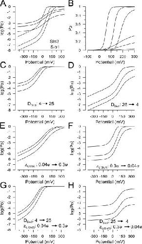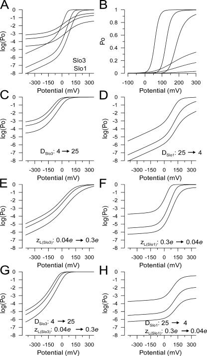 Figure 8. The primary differences between the voltage dependence of Slo3 and Slo1 conductance arise from differences in zL and D. In A, predicted log(Po /V) relationships for Slo3 based in parameters in Table I for pH 7.0, 7.6, and 8.5 are shown in red, along with predictions for Slo1 based on values from Horrigan and Aldrich (2002; and Table I) for [Ca2+] of 0.01, 1, and 10 μM. In B, the same relationships are plotted on a linear Po scale. In C, the value of D for Slo3 was changed from 4 to 25 to approximate that for Slo1, resulting in a similar maximal saturating Po at each pH. In D, the value of D for Slo1 was changed from 25 to 4. In E, zL for Slo3 was changed from 0.04 e to 0.3 e to approximate that for Slo1, changing both the limiting slope at negative potentials and the tendency toward saturation at positive potentials. In F, the value of zL for Slo1 was changed to 0.04 e. In G, values for zL and D for Slo3 were simultaneously changed to those describing Slo1, while in H, values for zL and D for Slo1 were changed to those characteristic of Slo3. In both cases, simultaneously changing both zL and D in large measure accounts for the characteristic differences between Slo1 and Slo3.