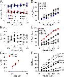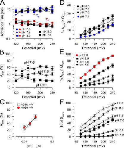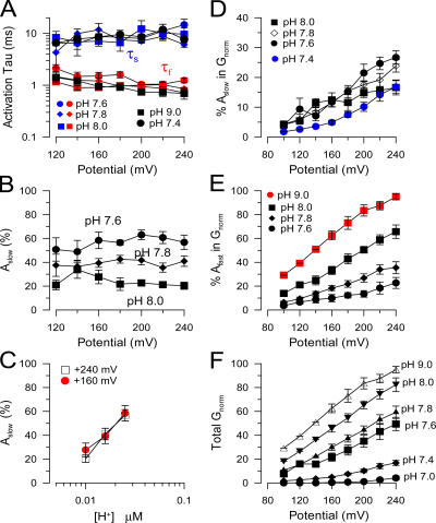 Figure 11. Properties of two components of slo3 activation. In A, fast (red) and slow (blue) time constants of activation at the indicated pH are plotted as a function of activation potential. Error bars are SEM of seven to eight estimates. The single exponential described activation at pH 9.0 closely approximates the fast time constant of activation, while the single exponential describing activation at pH 7.4 approximates the slow time constant. The fast time constant appears to become somewhat faster with depolarization. In B, the percent of the slow activation component is plotted as a function of voltage for three different pH. The relative contribution of the slow component does not change with command potential, but decreases with increases in pH. In C, the percent of the slow component is plotted as a function of pH for two different voltages. The percent of the slow component increases as pH is decreased. At pH 7.4, slow component contribution approaches 100%, while at pH 9.0, it is less than 5%. In D, the absolute contribution of the slow component to normalized conductance is plotted as a function of voltage for different pH. In E, the contribution of the fast component to conductance is plotted as a function of voltage for different pH. All conductance values in D and E were normalized within patches to the maximum conductance observed at pH 9.0. In F, the voltage dependence of the sum of the fast and slow component of conductance is illustrated, approximating the macroscopic steady-state G/Vs.