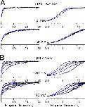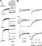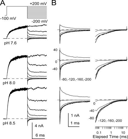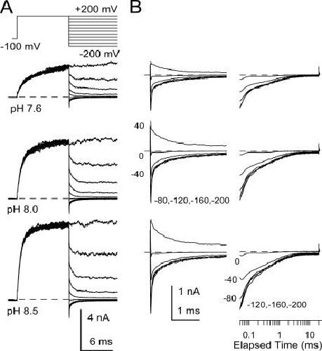 Figure 12. Slo3 deactivation contains two components. In A, the indicated voltage step protocol was used to examine tail current properties at potentials from −200 to +180 at various pH as indicated. Peak tail current at −200 mV is markedly nonohmic in comparison to current at +200 mV. 50 kHz sampling rate; 10 kHz filter. In B, the tail currents in A at potentials from +40 to −200 mV shown on a faster time base to emphasize the fast and slow components of the decay process. Traces on the left are shown on linear time scale, while those on the right are plotted on a logarithmic time scale.