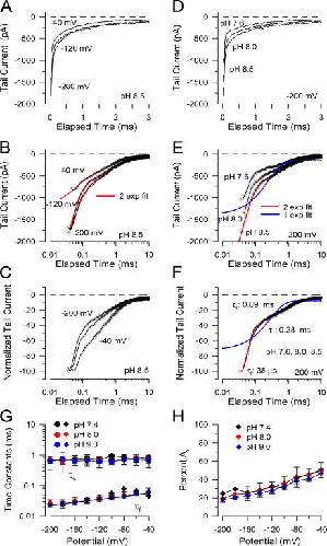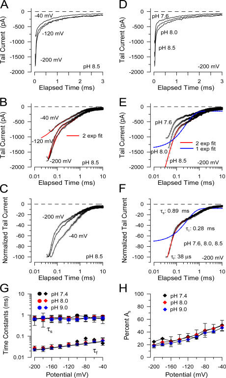 Figure 13. Dependence of deactivation on voltage and pH. In A, tail currents at pH 8.5 are shown on a linear time scale for −40, −120, and −200 mV. In B, traces from A are shown on a logarithmic time scale along with a two component exponential fit (red lines) to the decay process. In C, tail currents from B were normalized to their maximum amplitude to illustrate the decrease in the relative amplitude of the slow exponential component at more negative potentials. In D, tail currents at −200 mV are compared for pH 7.6, 8.0, and 8.5. In E, the traces in D are plotted on a logarithmic time scale. For the example at pH 8.5, the best fit of a single exponential function (blue line) and a two component exponential function (red line) are compared. Time constant for the single exponential fit was 0.28 ms, while for the two component fit, τf = 38 μs and τs = 0.89 ms. In F, normalized tail currents at −200 mV, but at different pH, show a similar time course. Fits are as in E. In G, slow (τs) and fast (τf) time constants from tail currents are plotted as a function of potential for pH 7.4, 8.0, and 9.0. For τf, the line corresponds to τf(V) = τf(0)exp(zV/kT), where τf(0) = 0.071 ± 0.004 μs and z = 0.147 ± 0.01 e. In H, the voltage dependence of the contribution (percent) of the slow component to the tail current is shown for pH 7.4, 8.0, and 9.0.
