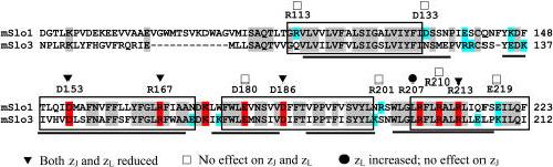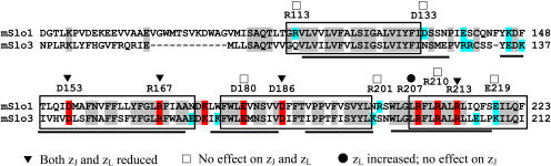 Figure 14. Residues implicated in voltage sensing in mSlo1 are conserved in mSlo3. Alignment compares mSlo1 and mSlo3 sequence from S1–S4. Boxed regions indicate S1–S4 defined by standard hydropathy plots, while black horizontal lines highlight putative α-helical segments defined from structural analysis (Jiang et al., 2003). Charged residues highlighted in red are identical between Slo1 and Slo3, while other identical residues are shaded in gray. Charged residues that are not conserved are highlighted in blue. All residues shown to influence both zJ and zL in Slo1 (Ma et al., 2006) are conserved between Slo1 and Slo3 (▾). A number of charged Slo1 residues shown to have no effect on either zJ or zL (□) are not strictly conserved in Slo3, while mutation of R207 has novel effects on zL.