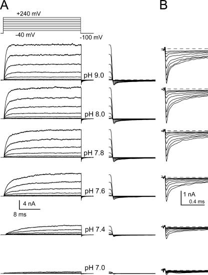 Figure 1. Increases in pH result in increased Slo3 current activation. (A) An inside-out patch expressing Slo3 channels was bathed with 0 Ca2+ solutions with pH set to the indicated nominal values. Patches were activated by the indicated voltage protocol. Minimal current activation is observed with pH 7.0 even at +240 mV. Increases in pH result in faster and more robust current activation. (B) Tail currents from the panels in A are shown on a faster time base on the left and with larger amplification on the right. Note that even at the highest pH, the tail currents do not exhibit saturation in activation of conductance.
