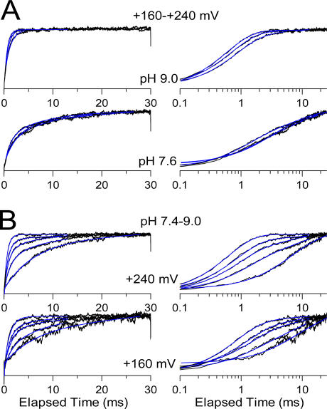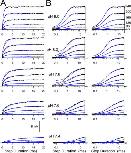 Figure 9. Slo3 activation time course is defined by two exponential components. In A, the Slo3 activation time course is illustrated for pH from 9.0 to 7.4 (top to bottom) at voltages from +40 to +240 mV. Blue lines indicate single exponential fits (I(t) = Aexp(−t/τ) + C)) to the activation time course, which at pH 7.6, 7.8, and 8.0 fails to describe the activation time course. In B, the same traces are shown on a logarithmic time axes along with either a single exponential (left traces) or a two exponential (I(t) = Asexp(−t/τs) + Afexp(−t/τf) + C; right traces) fit to the activation time course. The activation time course is best described by two exponential components.