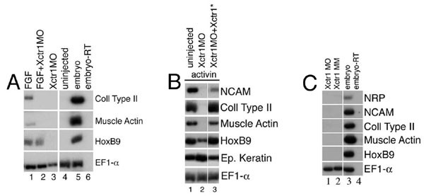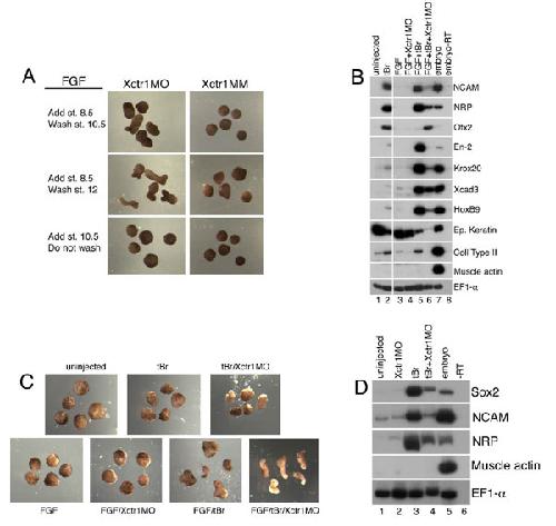 Fig. 9. Effects of Xctr1 knockdown in late neurula stage animal cap explants. RT-PCR analysis of stage 20 animal cap explants dissected at stage 8.5 and cultured in the presence or absence of added growth factors. (A) Effects of Xctr1 knockdown on FGF-mediated mesoderm induction at late neurula stages. (B) Effects of Xctr1 knockdown on activin-mediated induction at late neurula stages, and their rescue by coexpression of 500 pg Xctr1* RNA. Xctr1*, like Xctr1, induces expression of the neural marker NRP-1, albeit at higher doses than wild type (data not shown). (C) Xctr1 knockdown does not induce mesodermal or neural marker genes in animal cap explants at late neurula stages; Xctr1 knockdown also fails to induce neural crest markers in early neurula stage explants (data not shown). Animal caps were isolated from uninjected embryos, or from embryos injected with 250 ng of either Xctr1MO or Xctr1MM morpholinos at early cleavage stages, and cultured with 10 ng/ml FGF or 0.5 ng/ml activin as listed.