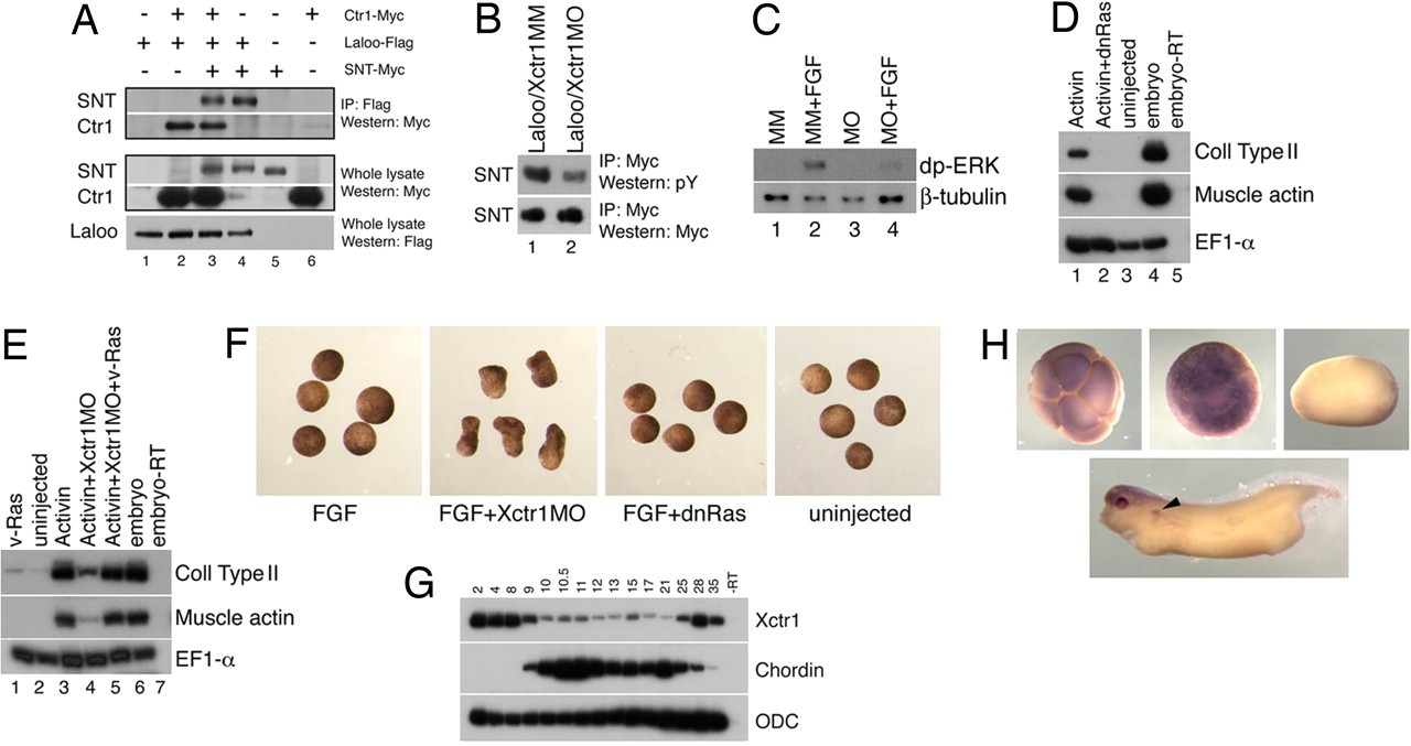 Fig. 3. Xctr1 regulates Ras-ERK signaling. (A) Coprecipitation of Xctr1, Laloo, and the docking protein, SNT-1/FRS2α. (B) Xctr1 knockdown inhibits Laloo-mediated SNT-1 phosphorylation (0.37 ± 0.11-fold reduction by Xctr1MO; n = 3). Signal represents the phosphorylation of up to six tyrosine residues on SNT-1 (10â12). (C) Xctr1 knockdown inhibits ERK phosphorylation (0.62 ± 0.27-fold reduction by MO; n = 4). Effects of injection of Xctr1MO and Xctr1MM on the FGF-mediated dual phosphorylation (dp) of the ERK MAP kinase in animal cap explants. Explants were cultured in the presence of FGF for 2 h before Western blot analysis; inhibition of ERK phosphorylation by Xctr1MO was not apparent for the first hour of FGF stimulation (data not shown). (D) Inhibition of activin-mediated dorsal mesoderm induction in animal cap explants by 1 ng of dominant inhibitory Ras (dnRas) RNA (1). (E) Rescue of Xctr1 morpholino-mediated dorsal mesoderm inhibition by coinjection of 40-pg constitutively active Ras (v-Ras) RNA (1). (F) Injection of 1 ng dnRas RNA does not enhance elongation of animal caps by FGF. Ras inhibition also inhibits elongation in FGF-treated caps from embryos injected with Xctr1MO (data not shown). (G) RT-PCR analysis of Xctr1 expression in early stage Xenopus embryos. (H) Whole-mount in situ hybridization analysis of Xctr1 expression. Stages (Upper) 4, 8 (animal views), 18 (dorsal view), and (Lower) 32 (lateral view) are shown. Pronephric tubules are indicated by arrowhead; 250-ng morpholinos were injected at early cleavage stages as listed, and 10 ng/ml FGF and 0.5 ng/ml activin were added to animal cap explants at stage 8 as listed.