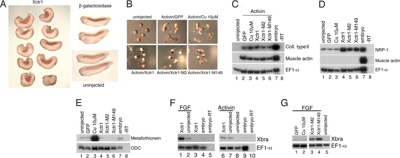 Fig. 1. Xctr1 misexpression inhibits morphogenesis in explants and embryos. (A) Whole-mount immunohistochemistry of stage 32 Xenopus embryos injected in the dorsal marginal zone at early cleavage stages with 1 ng of either Xctr1 or β-gal RNA. The 12/101 antibody is directed against a somite-specific epitope at this stage. (B) Effects of injection of RNA from wild-type and mutant Xctr1 on activin-mediated elongation of stage 20 animal caps; 1 ng of GFP RNA-injected animal caps were used as an injection control. Animal caps were explanted at stage 8; immediately after dissection, activin was added at a concentration of 0.5 ng/ml, and CuSO4 was added to achieve a concentration of 10 μM as indicated. (CâE) RT-PCR analysis of the effects of copper, wild-type, and mutant Xctr1 constructs on dorsal mesoderm induction by activin (stage 20) (C), neural induction (stage 20) (D), and metallothionein expression (stage 11) (E). (F) Xctr1 synergizes with FGF, but not activin, to induce Xbra expression (stage 13). (G) Copper-binding Xctr1 mutants, but not copper, synergize with FGF to induce Xbra expression (stage 13). Explants were treated with 0.5 ng/ml (C) or 0.1 ng/ml (F) activin protein or 10 ng/ml FGF protein (F and G) as listed; 1 ng of wild-type or mutant Xctr1 RNA was injected at early cleavage stages as listed.