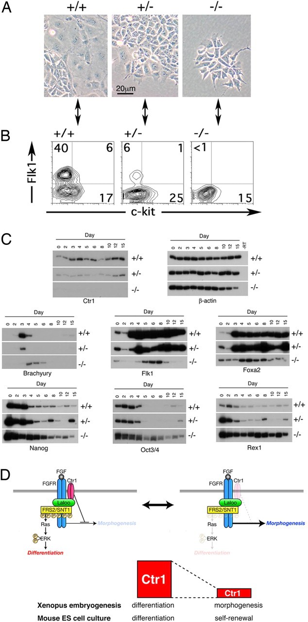 Fig. 4. Ctr1 â/â ES cells exhibit prolonged pluripotency and defects in differentiation. (A) Morphology of wild-type, Ctr1 +/â, and Ctr1 â/â monolayers cultured for 4 days in the absence of LIF. Two lines each of Ctr1 +/â and Ctr1 â/â ES cells were assayed with similar results. One line derived from a wild-type blastocyst served as a control. (B) Flow-cytometric analysis of Flk-1 protein expression in wild-type, Ctr1 +/â, and Ctr1 â/â monolayers cultured for 4 days in the absence of LIF. Levels of c-Kit, a protein expressed in undifferentiated ES cells, hematopoietic stem cells, and germ cells, were not altered in Ctr1 +/â or Ctr1 â/â monolayers (41). Plots correspond to cells in A, as denoted by arrows. (C) RT-PCR analysis of wild-type (+/+), Ctr1 +/â, and Ctr1 â/â EB cultures. Differentiation is inhibited in the Ctr1 â/â EBs, whereas markers of pluripoptent ES and/or germ cell progenitors are enriched in these cultures. Morphology and expression of ES cell markers in Ctr1 +/â lines generally resembled that seen in wild-type lines. Expression of markers of differentiated fates was often slightly delayed and/or diminished relative to that seen in wild-type cells, suggesting a modest Ctr1 haploinsufficient phenotype (this figure and data not shown). In this regard, we note that Ctr1 +/â mice are viable and fertile (31, 32). β-actin was used as a loading control. (D) Proposed function of Ctr1 during early vertebrate development. (Upper) Model depicting a role for Xctr1 in the interpretation of FGFâreceptor interaction as either a differentiation (Left) or a morphogenesis (Right) cue. (Lower) Comparison of Ctr1 function in amphibian embryonic and mammalian ES cell development. Red bars signify levels of Ctr1 activity.