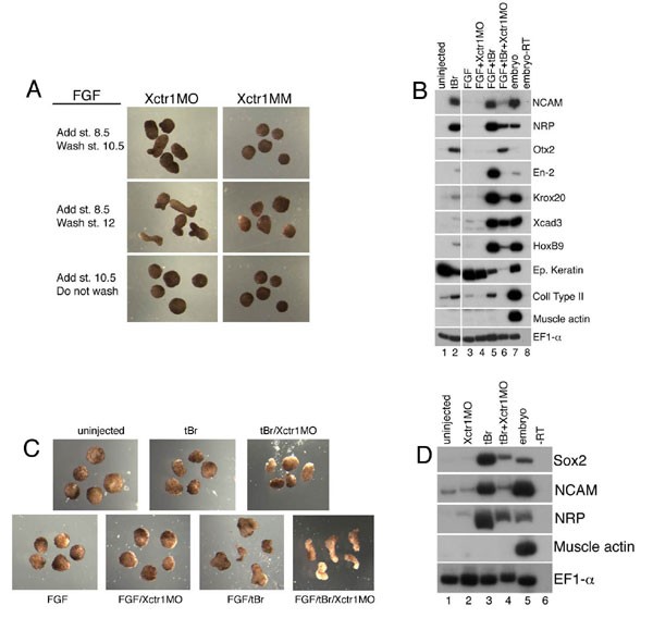 Fig. 10. Xctr1 knockdown enhances mesodermal and neural morphogenesis. (A) Analysis of the timing of FGF addition on Xctr1 knockdown-mediated morphogenesis. Addition of FGF at midblastula stages (st 8.5), followed by removal (through washing) at midgastrula (st 10.5; Top) or late gastrula stages (st 12; Middle) is sufficient to induce elongation at late neurula stages (st 18); constant exposure of explants to FGF from midgastrula to late neurula stages, however, does not promote elongation (Bottom). (B) Xctr1MO inhibits markers of caudal neural fate; molecular markers are as described (1). To obtain neural tissue, animal caps were isolated from embryos injected with RNA encoding a truncated Bone Morphogenetic Protein 4 (BMP4) receptor (tBr), shown to generate anterior neural fate in ectodermal explants (2). FGF protein was added at stage 11, when explants are no longer competent to respond to mesoderm-inducing cues: FGF posteriorized tBr-induced neural tissue, inducing markers of the midbrain-hindbrain boundary (en-2), hindbrain (krox20), and spinal cord (Xcad3 and hoxB9), and decreased expression of the forebrain marker otx2. Coinjection of Xctr1MO inhibited expression of both general and caudal neural markers. (C) Xctr1MO enhances elongation of posterior neural tissue. (D) Xctr1 knockdown inhibits neuralization. Induction of the neural-specific markers NCAM, NRP-1, and Sox2 by tBr is inhibited by coinjection of Xctr1MO. Animal caps were isolated from uninjected embryos or from embryos injected with 2 ng tBr RNA and 250 ng of either Xctr1MO or Xctr1MM morpholinos at early cleavage stages as listed; 10 ng/ml FGF was added as indicated.