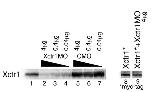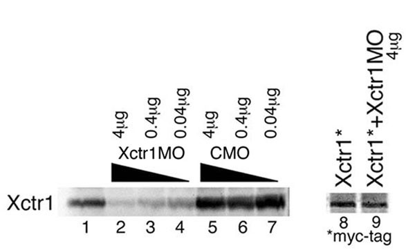 Fig. 7. Effects of control and Xctr1 morpholinos on the in vitro translation of Xctr1 and Xctr1* (Myc-Xctr1) RNA. Xctr1MO inhibits Xctr1 translation but not the translation of Xctr1* in a rabbit reticulocyte system. Xctr1 translation in vitro is not affected by the presence of either an unrelated control morpholino (CMO), or an Xctr1MO variant with five base-pair mismatches (Xctr1MM; data not shown).