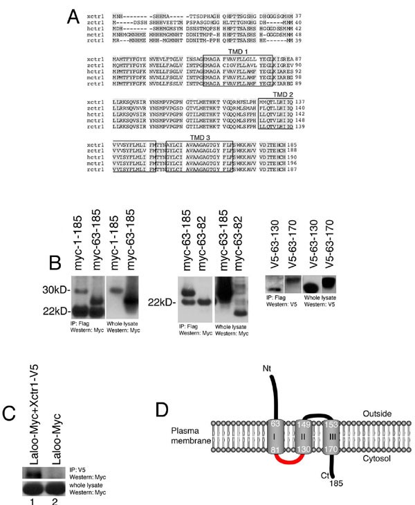 Fig. 5. Xctr1 associates with the Src kinase Laloo. (A) Alignment of vertebrate ctr1 genes. Putative transmembrane domains (TMD) 1-3 are boxed. (B) Identification of the Laloo-interacting domain of Xctr1 by coprecipitation of Xctr1 deletion constructs. Numbers denote amino acid residues of Xctr1. Immunoprecipitation of Flag-tagged Laloo was followed by Western blot analysis of Myc-tagged Xctr1 constructs. 1 ng each of RNA encoding Flag-tagged Laloo and Myc-tagged Xctr1 deletion constructs was injected, as listed, at early cleavage stages. (C) Detection of Laloo by Western blot analysis of coexpressed, immunoprecipitated, full-length Xctr1; 1 ng each of RNA encoding Myc-tagged Laloo and V5-tagged Xctr1 was injected, as listed, at early cleavage stages. (D) Schematic of the Xctr1 protein. The intracellular loop domain of Xctr1 (red) is sufficient for interaction with Laloo. Schematic after (22).