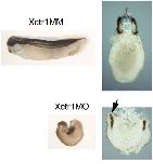 Fig. 8. Inhibition of neural and mesodermal development in Xctr1-depleted embryos. Whole-mount immunohistochemistry of embryos injected with Xctr1MM or Xctr1MO morpholinos, and stained with the somite-specific antibody 12/101 (brown) and the neural-specific antibody Xen-1 (blue); vibratome sections are shown at right. 12/101-positive tissue in Xctr1MO-injected morpholinos, when present, did not coalesce into the chevron pattern characteristic of somites in stage 33 Xenopus embryos. Neural tissue was disorganized and significantly diminished in Xctr1-depleted embryos; this effect may be secondary to the inhibition of dorsal mesoderm formation, and/or to defects in morphogenesis. 250 ng morpholino oligos were injected into the marginal zone of early cleavage stage embryos, as listed.