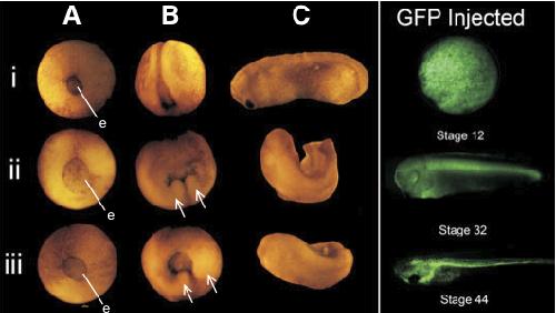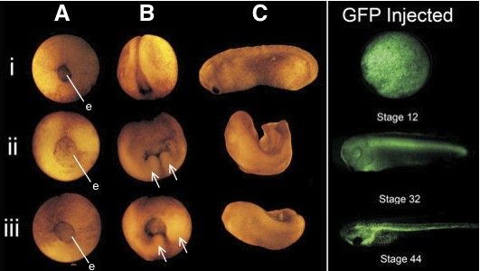 Matrix metalloproteinases (MMPs) are a family of endopeptidases that cleave and remodel the extracellular matrix (ECM). Membrane-type 3 MMP (MT3-MMP) is a membrane-anchored MMP, which has recently been shown to 'shed' from the cell surface in a soluble form upon proteolytic cleavage. Shed MT-MMPs can activate gelatinase-A in vitro and have been directly linked to the metastatic potential of many cancers. Here we examined the effect of ectopic expression of full-length tethered and shed (soluble) forms of MT3-MMP during Xenopus laevis development. Injection of mRNA coding for full-length tethered MT3-MMP resulted in the delayed onset of gastrulation and subsequent defects. Phenotype severity and the frequency of embryo death were dose-dependent. Dose-dependent defects were also observed with the injection of mRNA of the soluble form, but the phenotypes and frequencies of death were greater. Histological analysis of injected embryos demonstrated defects in the organization of axial structures, such as the neural tube and somites. Embryos injected with full-length MT3-MMP mRNA showed no significant changes in expression levels of the tissue specific genes endodermin, chordin and muscle actin when examined by semi-quantitative RT-PCR. In contrast, embryos injected with the soluble form of MT3-MMP exhibited decreased expression of these same marker genes. In addition, while full-length tethered MT3-MMP failed to alter gelatinase activity, a 50% increase was measured in response to injection of the soluble form, suggesting that the two forms of this protein could play distinct roles during embryogenesis.