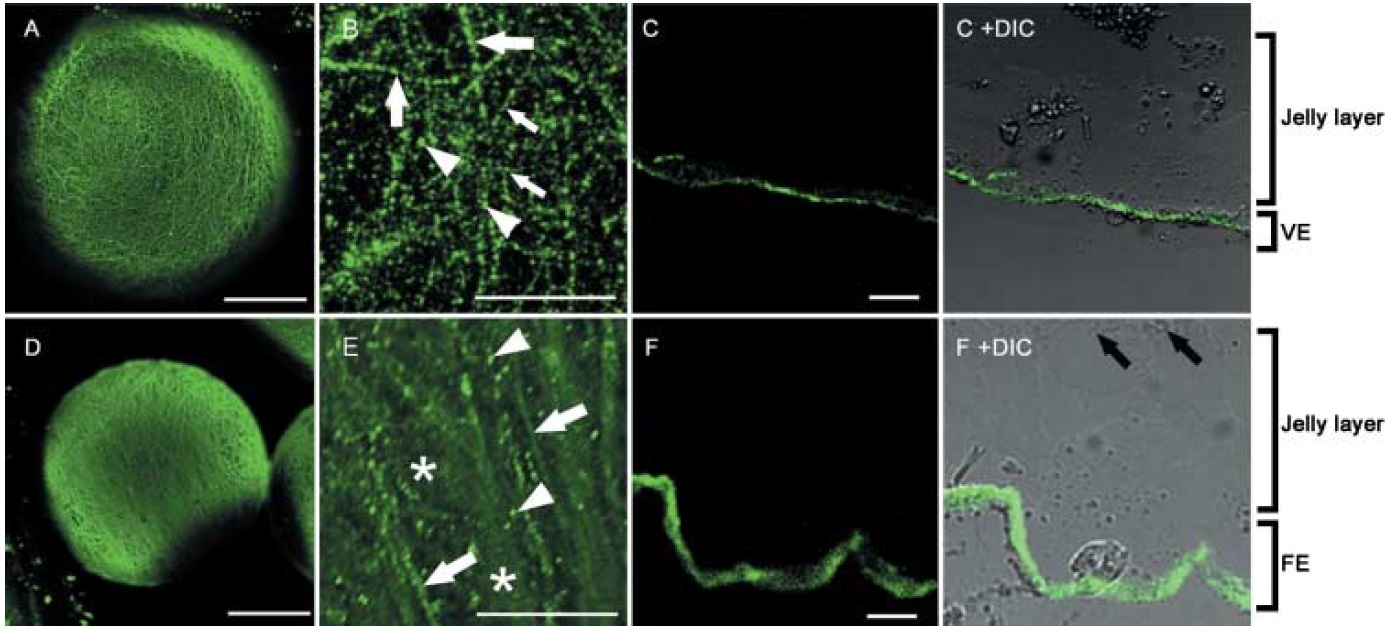 (C) and on the FE (F). The jelly layer occupies the upper side of the envelope in C and F. Neither in unfertilized nor fertilized eggs