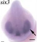 six3 (SIX homeobox 3) gene expression in Xenopus laevis embryo, assayed via in situ hybridization, NF stage 21, anterior view dorsal up.