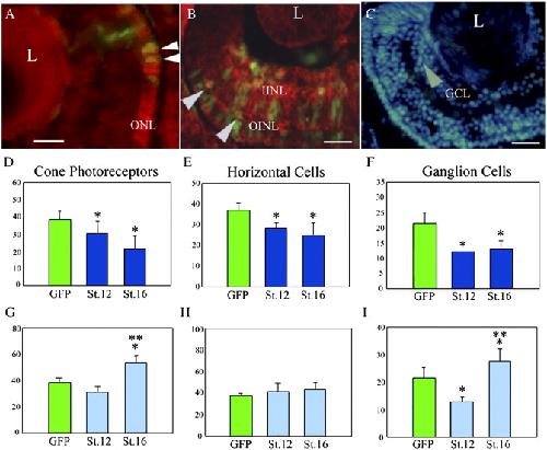 Fig. 1. Altered levels of rx1 expression affect blastomere D1.1.1 contributions to retinal cell types. (AâC) Representative cell types from each cell layer were labeled by immunofluorescence for: (A) calbindin-positive cone photoreceptors (red) in the ONL [bar = 40 μm]; (B) GABA-positive (red) horizontal cells in the OINL (note that GABA also stains amacrine cells in the IINL) [bar = 30 μm]; (C) DAPI-positive nuclei (blue) of ganglion cells in the GCL [bar = 30 μm]. For panels AâC, arrowheads note GFP-labeled (green) descendants of blastomere D1.1.1. L, lens. (DâF) Activation of Rx1-GR protein at early (St. 12) and late (St. 16) neural plate stages decreased cell numbers significantly (*p < 0.05 cf. GFP-injected hormone treated controls) for all three cell types. (GâI) Activation of Rx1EnR-GR protein at St. 12 significantly decreased ganglion cells. Activation at St. 16 significantly increased cone and ganglion cell numbers, but horizontal cells were unchanged. (*p < 0.05 cf. GFP-injected hormone treated controls; **p < 0.05 cf. stage 12). Bars indicate SEM.