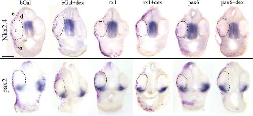 Fig. 3. Activation of Rx1-GR or Pax6-GR protein at stage 12 does not cause cells to contribute to alternate cell fates. Cells descended from the mRNA-injected D1.1.1 blastomere (red) contribute to head tissues in a pattern identical to normal fate maps (cf. Moody, 1987), including diencephalon (d), lateral epidermis (e), retina (r; outlined), and branchial arch mesoderm (ba). These patterns are consistent regardless of which mRNA was injected (βGal, rx1, pax6), and whether hormone (dex) was added to the culture medium. The expression domains of Nkx2.4 in the ventral diencephalon and pax2 in the optic stalk did not change after any of the treatments. Bar = 100 μm.