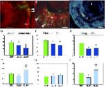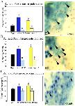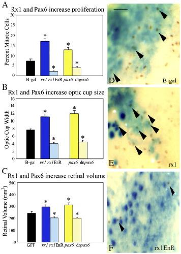 Fig. 4. Changing Rx1 and Pax6 levels/activity at stage 12 alters proliferation and the size of the retina. (A) rx1-GR (rx1) and pax6-GR (pax6) expressing clones contained a significantly larger proportion of mitotic cells than control (β-Gal) clones, whereas loss-of-function of rx1 (rx1EnR) or pax6 (dnpax6) resulted in a significantly decreased mitotic index. The mitotic indices of clones at stage 20 (optic vesicle) that descended from blastomere D1.1.1 were calculated by counting the number of cells in the clone (DâF, blue cytoplasm) that expressed phosphohistone-H3 (DâF, brown nuclei), a marker specific to mitotic prophase. Arrowheads note representative double-labeled cells. Bar = 10 μm. (B) The width of the optic cup at stage 25 was significantly larger when Rx1 or Pax6 levels were increased and significantly smaller when rx1EnR or dnpax6 mRNAs were expressed. (C) Retinal volume at stage 44/45 was significantly larger when Rx1 or Pax6 levels were increased and significantly smaller when rx1EnR or dnpax6 mRNAs were expressed. (*p < 0.05 cf. β-Gal or GFP dex-treated controls). Bars indicate SEM.