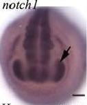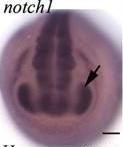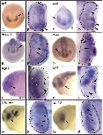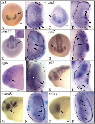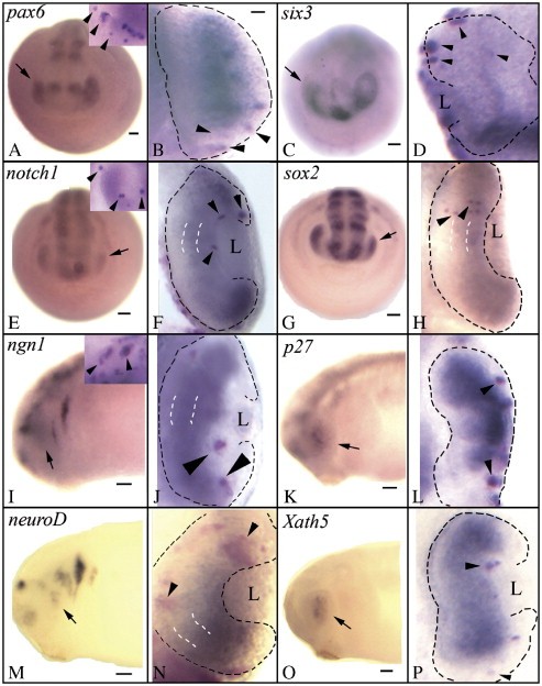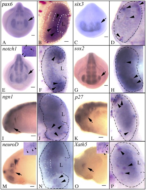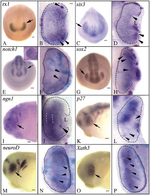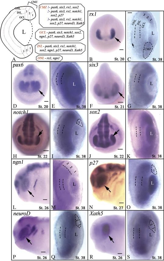 Fig. 5. Normal expression of stem cell (rx1, pax6, six3), neural identity (notch1, sox2) and differentiation (ngn1, p27, neuroD, Xath5) markers in control embryos. Embryos injected with β-gal mRNA were processed by in situ hybridization to determine the normal expression pattern of each marker gene. All stages 22â27 embryos are external views of whole-mount preparations [bars = 100 μm]; all stage 38 views are from whole mount preparations that were thickly sectioned to reveal internal expression patterns [bar = 20 μm]. (A) Summary of the expression domains of marker genes at stage 38 in the different layers of the retina, based on data from Perron and Harris (1999), Ohnuma et al. (1999) and our results. All genes except ngn1 are expressed in some part of the ciliary marginal zone (CMZ). Only pax6, rx1, six3 and sox2 are expressed in all zones of the CMZ. Other genes are expressed only in the zones of the CMZ (2, 3) closest to the central retina, which are thought to contain RPCs. Within the stage 38 central retina, these genes are differentially expressed in the three cellular layers (GCL, INL, ONL). L, lens. (B) rx1 is expressed throughout the optic cup (arrow). (C) At stage 38, rx1 is expressed in all zones of the CMZ and weakly in the ONL (arrow). (D) pax6 is expressed throughout the optic cup (arrow). (E) At stage 38, pax6 is expressed in the CMZ and throughout the GCL and INL. (F) six3 is expressed throughout the optic cup (arrow). (G) At stage 38, six3 is expressed throughout the CMZ, and in the GCL and INL; the faint staining in the ONL is due to the thickness of the section. (H) notch1 is expressed throughout the optic vesicle (arrow). (I) At stage 38, notch1 is expressed in zones 2 and 3 of the CMZ and throughout the GCL and INL. (J) sox2 is expressed throughout the optic vesicle (arrow). (K) At stage 38, sox2 is expressed in all zones of the CMZ, strongly in the GCL and is barely detected in the INL. (L) ngn1 is expressed in the central part of the optic cup (arrow). (M) At stage 38, ngn1 is expressed in all layers of the central retina, and is absent from the CMZ. (N) p27 is expressed broadly in the optic cup (arrow). (O) At stage 38, p27 is expressed in zones 2 and 3 of the CMZ and throughout the GCL and INL. (P) neuroD is expressed broadly in the optic cup (arrow). (Q) At stage 38, neuroD is expressed in zone 3 of the CMZ and throughout the GCL and INL. (R) Xath5 is expressed broadly in the optic cup (arrow). (S) At stage 38, Xath5 is expressed in zone 3 of the CMZ and throughout the GCL and INL.
