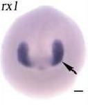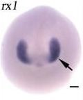 rax ( retina and anterior neural fold homeobox ) gene expression in Xenopus leaves embryo, NF stage 20 embryo, assayed by in situ hybridization, anterior view, dorsal up.