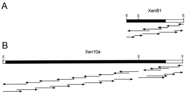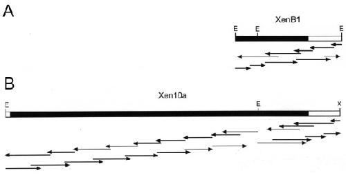Figure 1. Characterization of full-length cDNA for Xenopus IRBP. A) cDNA XenB1 isolated under low stringency conditions [40], was used here to screen under high stringency a Xenopus stage 45 swimming tadpole cDNA library. B) This screen led to the isolation of Xen10a, a full-length Xenopus IRBP cDNA whose sequence is shown in Figure 2. Arrows represent individual sequencing runs. The solid bars indicate coding regions. E, EcoR1; X, XbaI.