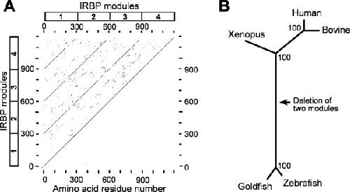 Figure 3. Comparison of Xenopus IRBP with itself and known IRBPs. A) Dotplot of Xenopus IRBP, comparing the protein sequence against itself. The boxes on the ordinate and abscissa are schematic diagrams of modules 1 through 4. The numbering on the axes correspond with the amino acid residues in Figure 2. The diagonal lines indicate regions of internal similarity, and hence the presence of the four modules. B) Distance tree showing the relationship between Xenopus, human, bovine, goldfish and zebrafish IRBPs. The branch lengths are drawn to scale and the values at the nodes indicate the number of times a grouping occurred in a set of 100 bootstrap values. The long distance separating the teleosts from amphibians is due in part to the teleosts having only two modules.