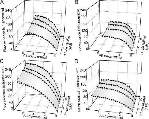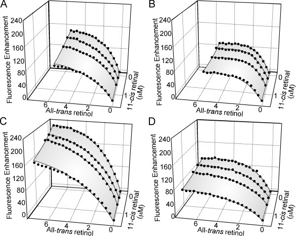 Figure 9. Competitive inhibition by 11-cis retinaldehyde of all-trans retinol binding to the individual modules of Xenopus IRBP. Binding of all-trans retinol to the individual modules was measured by fluorescence enhancement in the presence of varying amounts of 11-cis retinal. Panels A through D correspond to modules 1 through 4 respectively. Assuming both all-trans retinol and 11-cis retinal share the same binding sites, all-trans retinol binding to IRBP is competitively inhibited. Three dimensional nonlinear regression was used to determine the number of binding sites, the dissociation constant of all-trans retinol, and the dissociation constant of 11-cis retinal for each of the individual modules. The binding parameters are summarized in Table 3. The concentrations of the proteins used in the titrations were as follows: module 1 (0.99 μM; panel A); module 2 (1.10 μM; panel B); module 3 (1.10 μM; panel C); module 4 (1.00 μM; panel D).