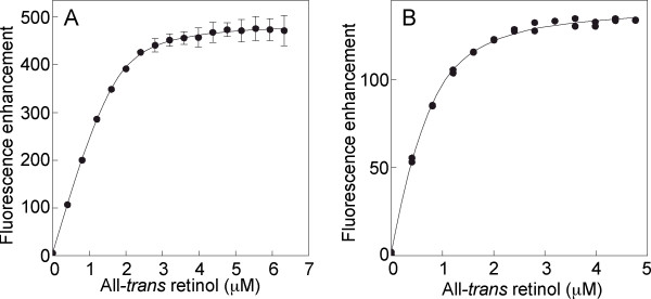 Figure 10. Retinol binding to Xenopus IRBPs consisting of two contiguous modules. Binding of double modules IRBPs with all-trans retinol as followed during titrations by monitoring the increase in retinol fluorescence (excitation, 330 nm; emission, 480 nm). The concentration of the IRBP double module was: modules 1&2, 0.67 μM; modules 3&4, 0.57 μM. A) Xen IRBP modules 1&2 showed N = 2.45 ± 0.11 with Kd = 0.049 ± 0.023 μM. B) Xen IRBP modules 3&4 showed N = 1.43 ± 0.21 with Kd = 0.19 ± 0.05 μM.