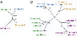 Figure 4. Phylogenetic relationship of the IRBP modules. A) Phylogenetic distances between various modules of Xenopus IRBP protein. The numbers at the junctions are the number of times a branch point occurred out of 100 bootstrap reiterations. The tree was rooted with module 4, the ancestral module. B) An unrooted distance tree showing the relationships between the various IRBP modules from different animals. The tree was constructed as in panel A. Even numbered modules are more closely related to each other than to odd numbered modules.